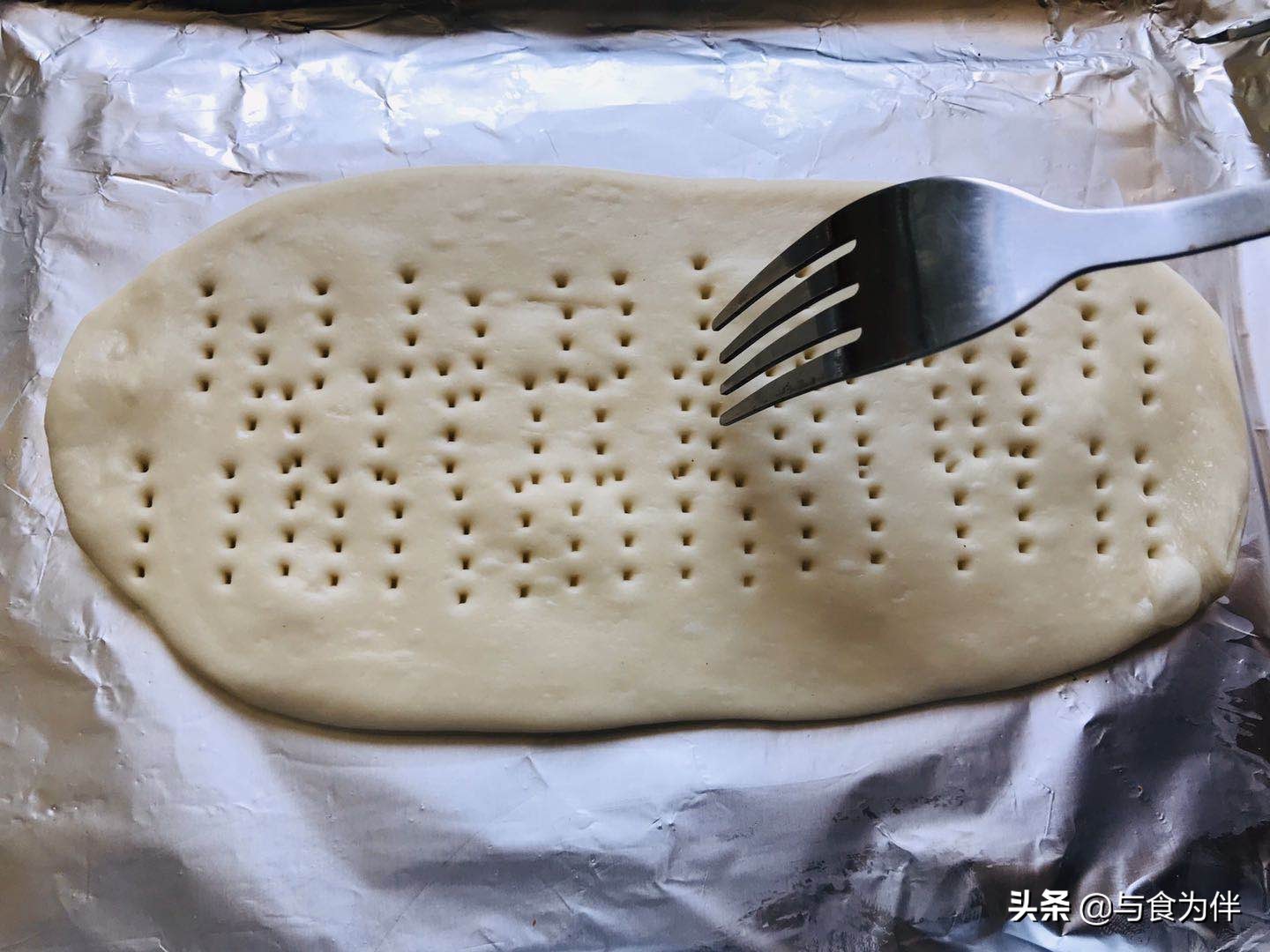第五步,取出发好的面团揉两下,把面团分成4到5份小面团,取1份小面团揉圆用擀面杖压成厚度为0.5厘米的椭圆形饼胚,烤盘底刷上一层油,把饼胚放入烤盘内,用叉子或者牙签在饼胚子上扎眼。烤盘铺上一层锡纸,防止油脂沾到上面不好清洗。