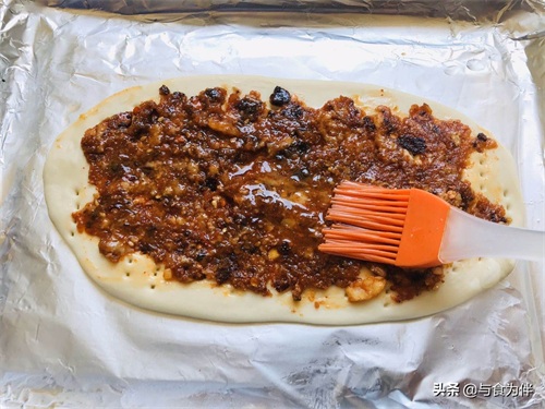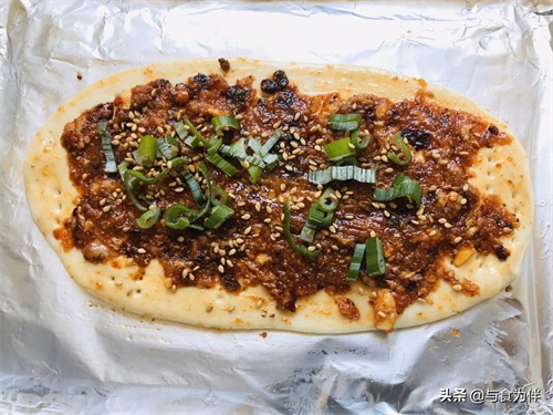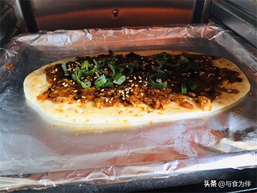 第六步,做好的馅料挖在饼胚上抹均匀,刷上一层调味油,撒上葱花和芝麻,烤箱预热5分钟后把烤盘和饼坯放入烤箱上层,温度调到230度烤上10分钟,戴上隔热手套取出即可,趁热吃口感最佳。