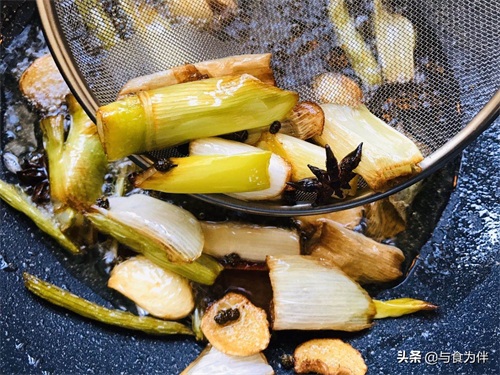 第三步,做调味油,烧热油锅,倒入200克油小火加热,放入芹菜段,大葱段,姜片,大蒜4掰,3个小八角,40粒麻椒,桂皮1小段,用小火炸干,炸黄,炸出香味后关火,捞出所有料渣把油倒入干净碗里,调味油就做好了。