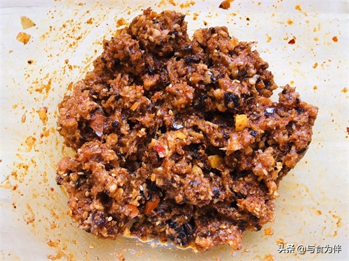 3,肉馅,肉要选择肥瘦相间的,然后跺成肉泥,再加入炒香后的郫县豆瓣酱料和各种调味料入味,配上肉松,可使肉馅紧紧沾附在饼胚上,不会脱落,也是增加肉味奇香的关键点。