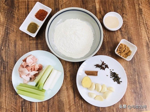 第一步,猪肉用刀剁成泥,芹菜择去叶子留下茎杆,洗净切成5厘米长段。大葱洗净切5厘米长的大段(4到5段),切点葱花。老姜去皮切片(3到4片),在切点姜末。大蒜取4掰去皮拍松散,剩下的2瓣切蒜末备用。