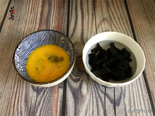 2.准备一小把干木耳,大概需要3g左右,不喜欢吃木耳的朋友可以少放,将木耳放到温水中泡发,碗中打入2个鸡蛋,搅散备用。