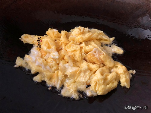 5.正式开炒之前,先往锅里加点油,油热以后把鸡蛋液倒进去小火滑熟,盛出备用。