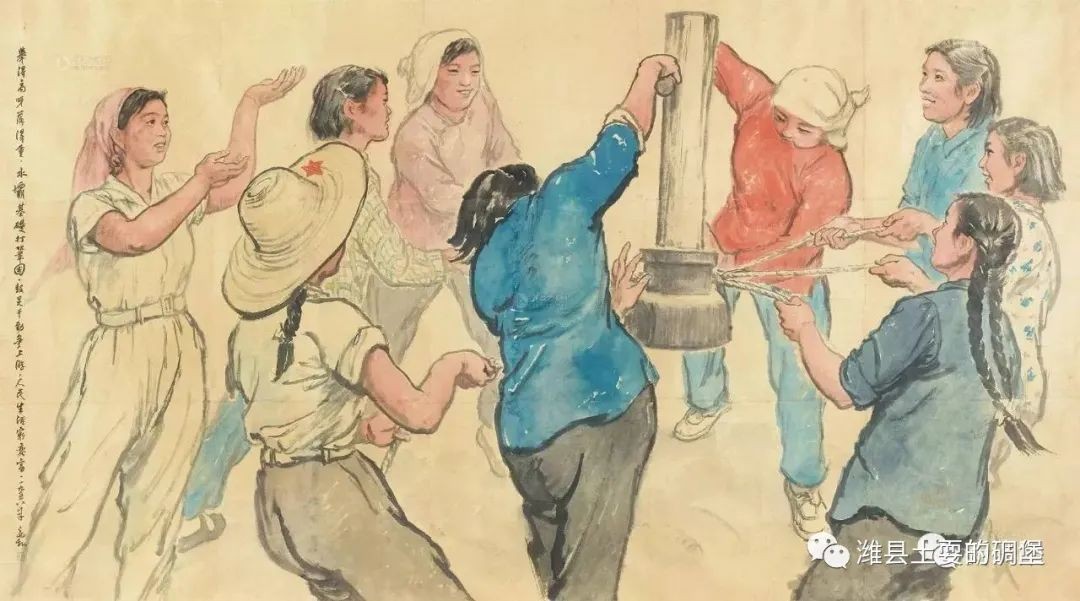 这种艰苦劳动中自发淳朴、亢奋热烈的生命状态,恰恰是关于艺术发生学中的艺术劳动说与艺术游戏说分类学说的统一谐调的最佳注解与完美诠释,更是非常标准的契合了我们所一贯坚守与倡导的主流意识形态,普罗列塔利亚劳苦大众的审美原则,劳工神圣、劳动光荣、劳动创造世界、劳动最伟大。难怪我们翻检二十世纪的中国现代美术史画卷,蒋兆和、董希文、王文彬等艺术巨匠及中坚力量,都不约而同地跨越了不同年代的差异,纷纷选择了热火朝天的打夯劳动场面作为了他们艺术创作的重要素材与表现图腾。