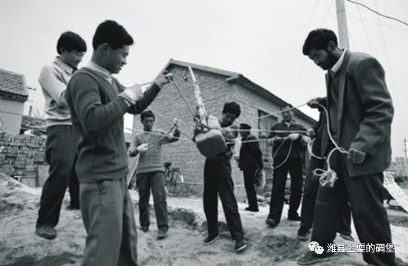 “打夯”就是多人用石夯或木夯拽着夯绳反复用力砸地,是造屋、垒墙、修路、筑坝时多用的一种古老的劳动方法。“打夯”也叫“打地基”,潍坊土话中也叫“打地脚(方言音jue)”。