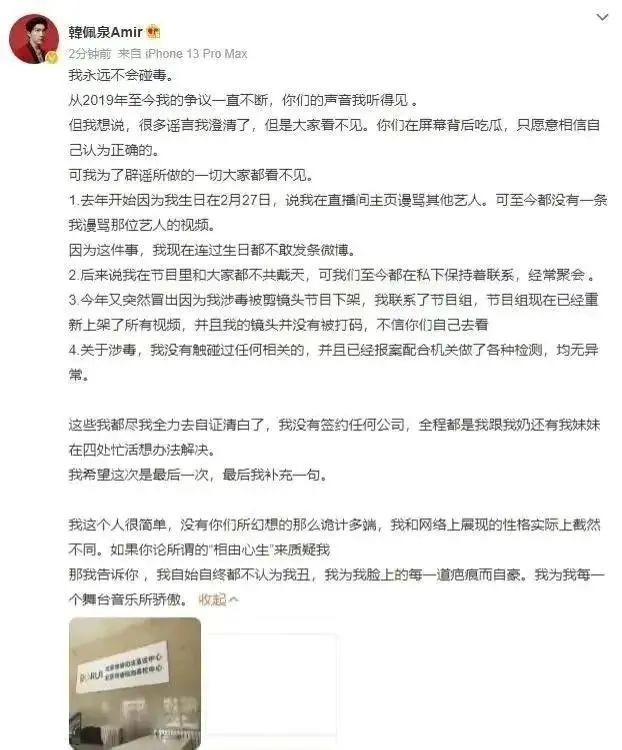 这一次,当全网质疑韩佩泉涉毒的时候,他也有出来澄清,发长文、去鉴定,再三强调自己没有吸毒,也永远不会碰毒。正如韩佩泉在长文开头说的那样,“很多谣言我澄清了,但是大家看不见。你们在屏幕背后吃瓜,只愿意相信自己认为正确的,可我为了辟谣所做的一切大家都看不见。”