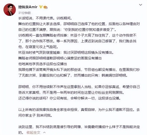 在节目中,韩佩泉与邵明明之间的事儿,也是两家粉丝争论不休的话题,邵明明方粉丝一直喊着“韩佩泉欠邵明明一个道歉”。