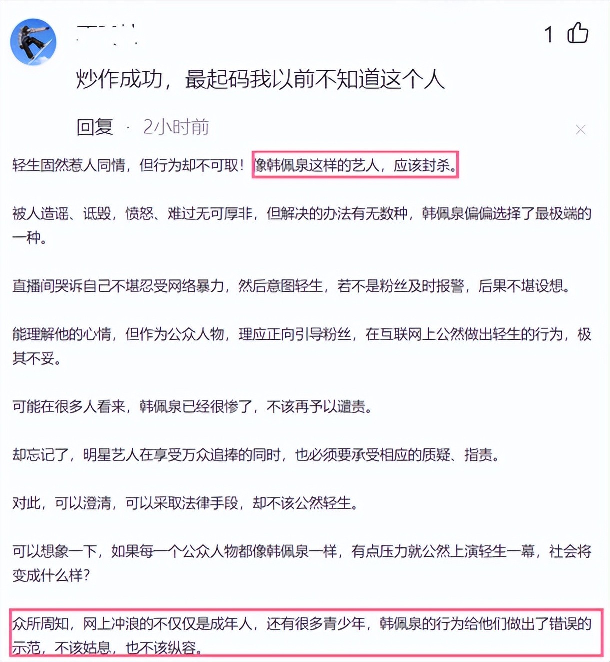 网络暴力到底何时能停止,人活着,遭受外界的诽谤不止,人选择轻生,外界也依旧指责他在炒作,给青少年带去了不好的影响。