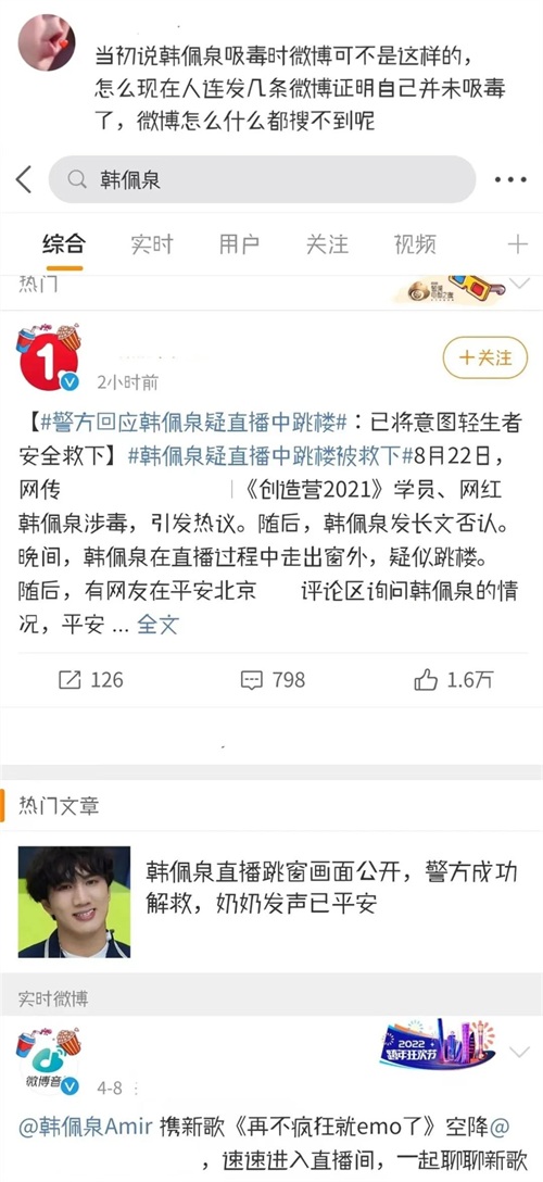 如今,再去某平台搜索韩佩泉,已经找不到任何相关话题了,仅剩一条警方回应的消息。韩佩泉的相关词条,也都被一并撤下,仿佛娱乐圈已经不存在这个人了一样。