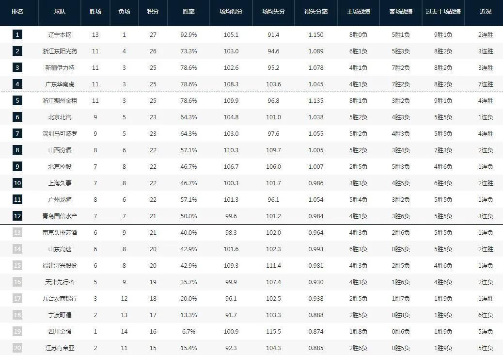CBA最新排名:辽宁独一档 6队争前4 吉林终结10连败 前冠军队沉沦