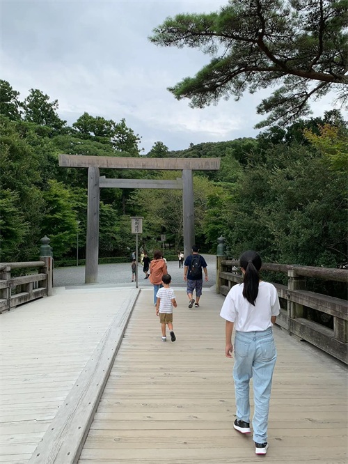 伊势神宫内宫门前的鸟居及跨越五十铃川的宇治桥