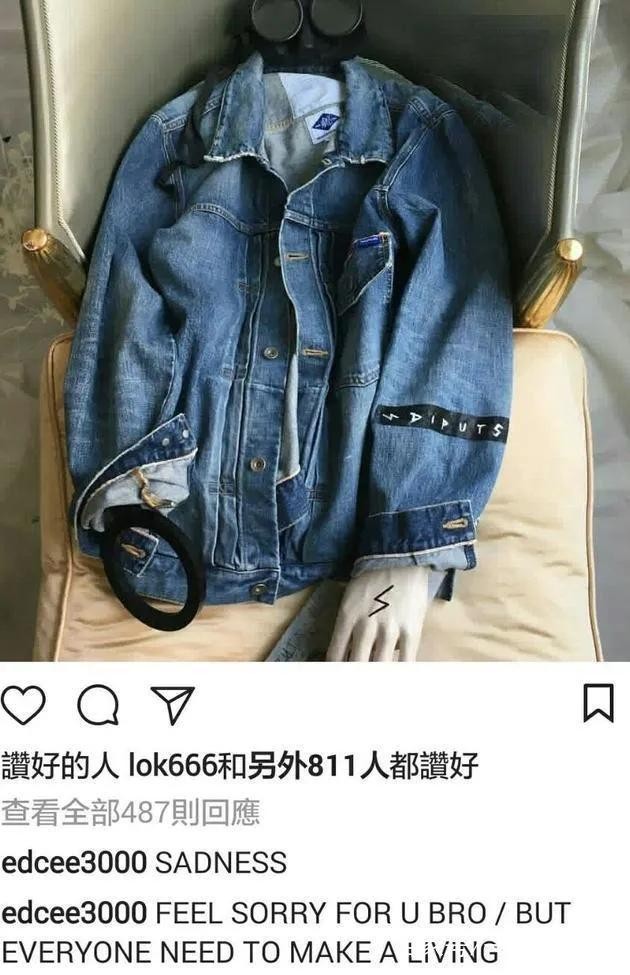 设计师Godfrey Kwan的Ins上发布了一件madness的牛仔大衣照片。陈冠希留下:“SADNESS(悲哀)”等明显在攻击余文乐潮牌的评论。
