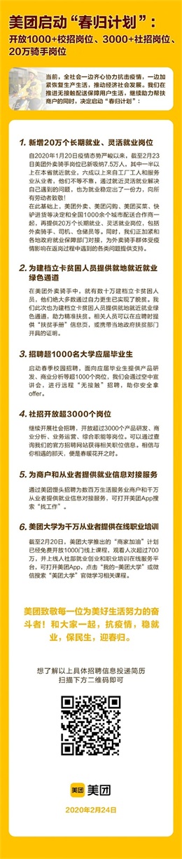 2月24日消息,美团宣布启动“春归计划”,向全国提供逾20万个工作岗位;为建档立卡贫困人员提供就地就近就业绿色通道;招聘超1000名大学应届毕业生;开放超3000个社招岗位;为商户和从业者提供就业信息对接服务;为千万从业者提供在线职业培训等。