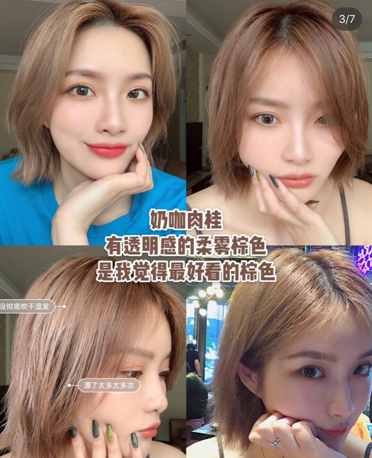 是我误打误撞染出来的一个棕色,粉色头发的情况下,染了灰绿的染膏就变成了这个颜色! 太神奇了!染发使我快乐! !是我唯一喜欢的暖调棕色了!