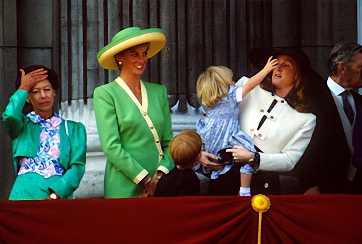 淘气的比阿特丽斯公主只是想在阳台上试一试她妈妈的帽子!当她的小女儿试图模仿她的风格时,莎拉·弗格森滑稽地向后靠,戴安娜王妃在一旁看着,笑着欣赏这对甜蜜的母女时刻。威廉王子也转身观看了这场比赛!