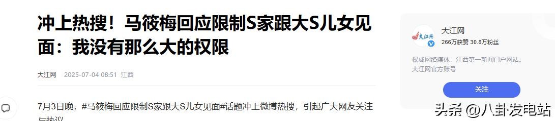 信息来源:大江网2025-07-04 冲上热搜!马筱梅回应限制S家跟大S儿女见面:我没有那么大的权限