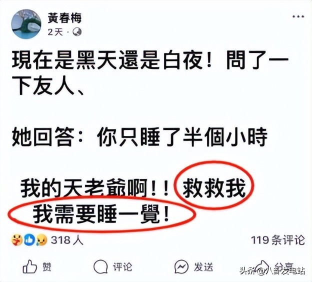 近日黄春梅女士又在社交平台上发动态了,她说道自己又分不清白天黑夜了,问了一下自己的朋友说自己就睡了半个小时,还大喊“救救我”,自己现在急需睡一觉。