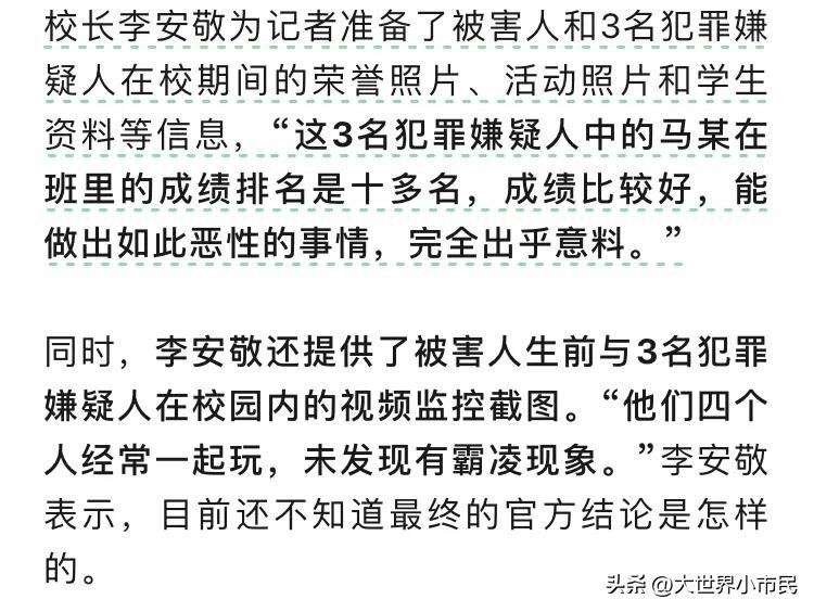 受害人生前就读的学校校长表示嫌疑人中的马某学习优秀“受害人与嫌疑人经常一起玩,未发现有霸凌现象”。但仅凭一段视频是否无法证明他们之间不存在霸凌问题?若学校和老师真的称职,为何对受害人的情况了解不足、关注不够?