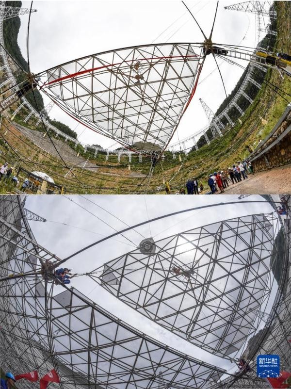 拼版照片:上图为2015年8月2日拍摄的“中国天眼”首块面板安装成功;下图为2016年7月2日拍摄的“中国天眼”吊装最后一块反射面板。