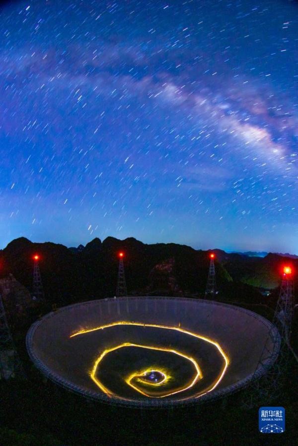 银河下的“中国天眼”全景(无人机光绘照片,2022年7月24日维护保养期间拍摄)。