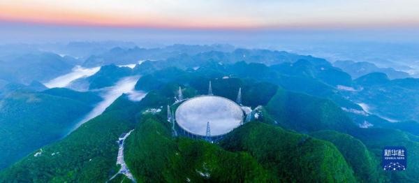 晨曦中的“中国天眼”全景(无人机照片,2022年7月25日维护保养期间拍摄)。