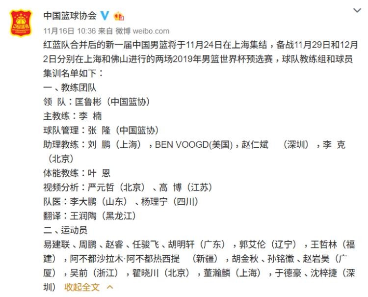 中国篮球协会官方公布新一届中国男篮国家队的集训名单,共有16名球员入选这一名单,这也是中国男篮红蓝集训队后首次合并参赛,新一届中国男篮将于11月24日在上海集结,备战11月29日和12月2日分别在上海和佛山进行的两场2019年男篮世界杯预选赛第五窗口期的比赛。