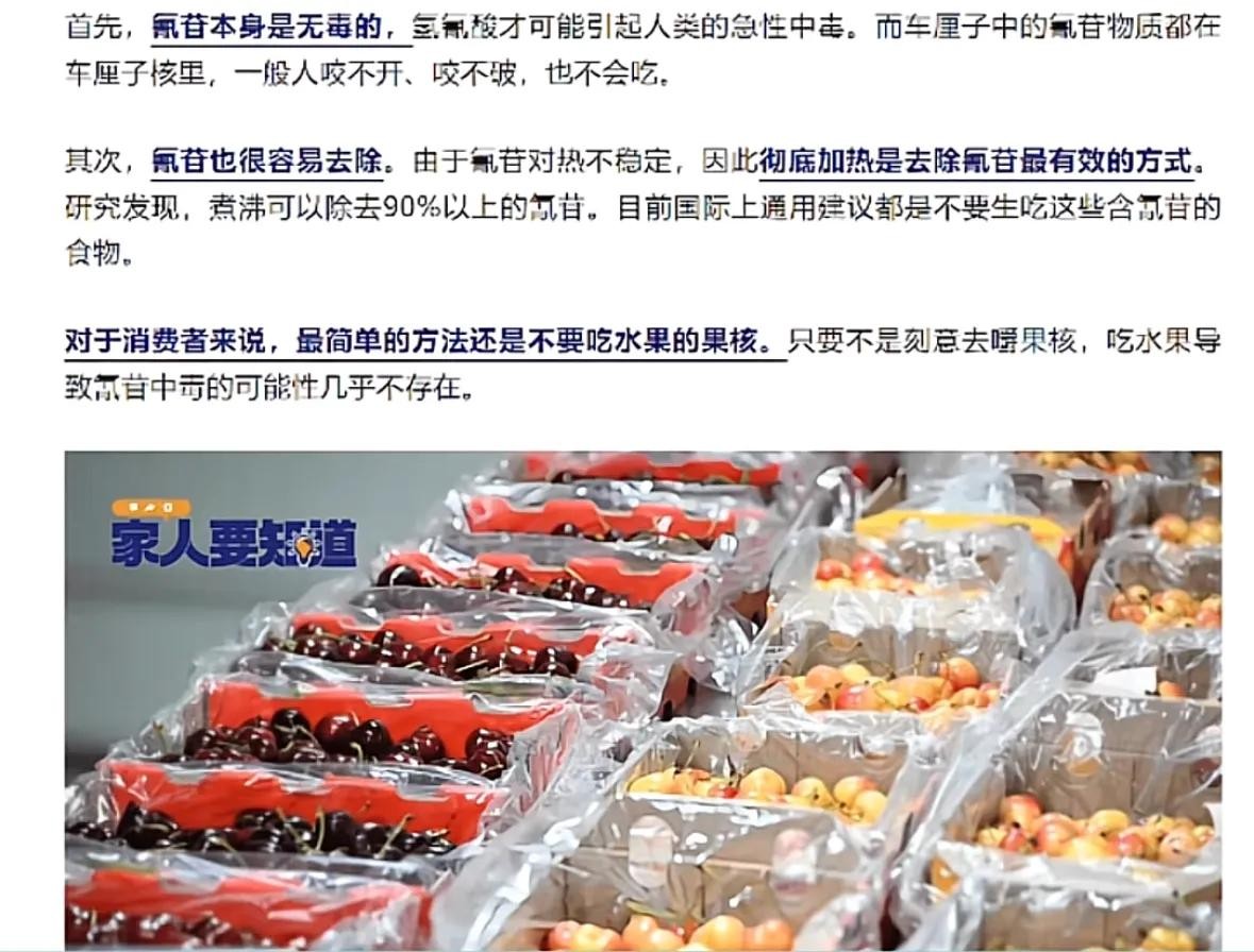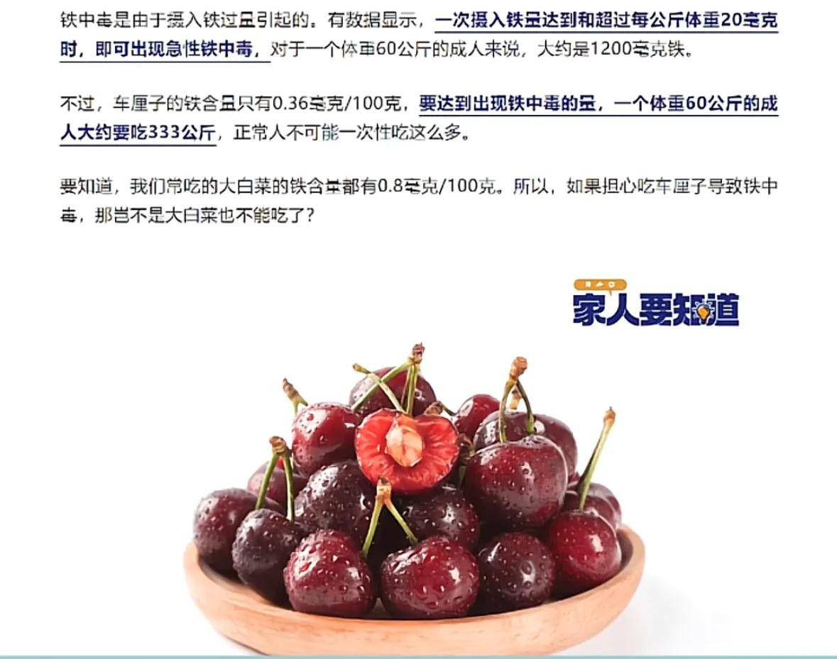 央视新闻呢,也及时进行一个辟谣和科普,想吃车厘子中毒就要确定一个概念,不是车厘子让你中毒了,是车厘子中的铁元素,造成了铁中毒。一个体重为60公斤的成年人大约要吃333公斤的车厘子要把车厘子的核咬碎咀嚼下咽后才有可能氰化物中毒。