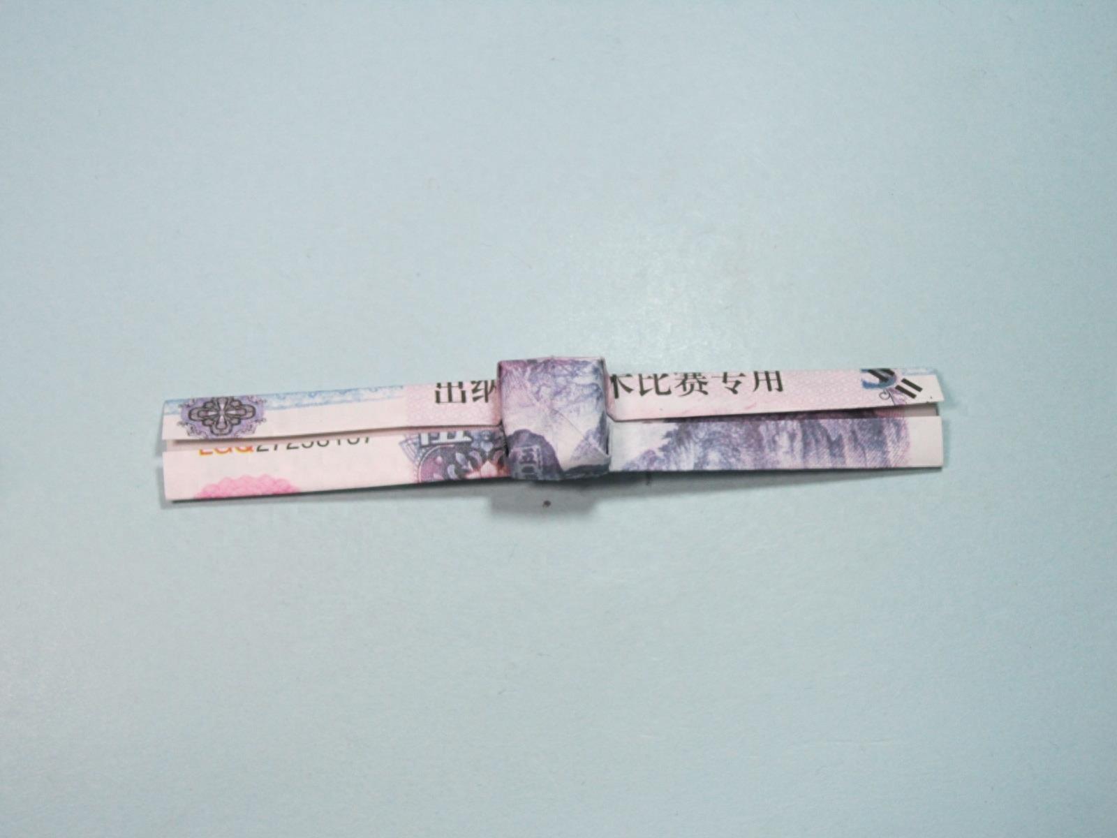 第1步、首先准备一张崭新的纸币,再将纸币的上下两条长边对折,展开,留下折痕。