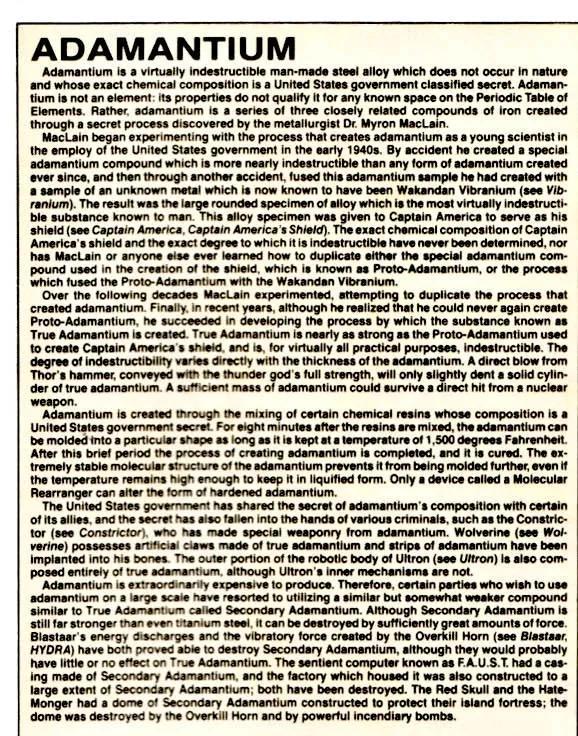 艾德曼合金的生产成本极其昂贵,它是通过混合某些化学树脂制成的,其确切成分是政府严密保护的机密。 树脂混合八分钟后,如果保持在 1,500 华氏度的温度下,艾德曼合金就可以成型。 其极其稳定的分子结构可防止其进一步成型,即使温度保持足够高以使其保持液态。 硬化的艾德曼合金只能通过重新排列其细胞结构来改变。 如果有足够的质量,艾德曼合金可以在核武器的直接打击或最强大的超人力量的打击下幸存下来。 唯一已知的能够穿透 艾德曼合金的物质是被称为南极振金的化合物,也被称为“反金属”。 艾德曼合金也有 13 种同素异形体,它们都不稳定且寿命短,有剧毒。