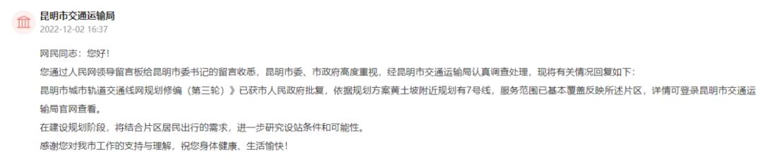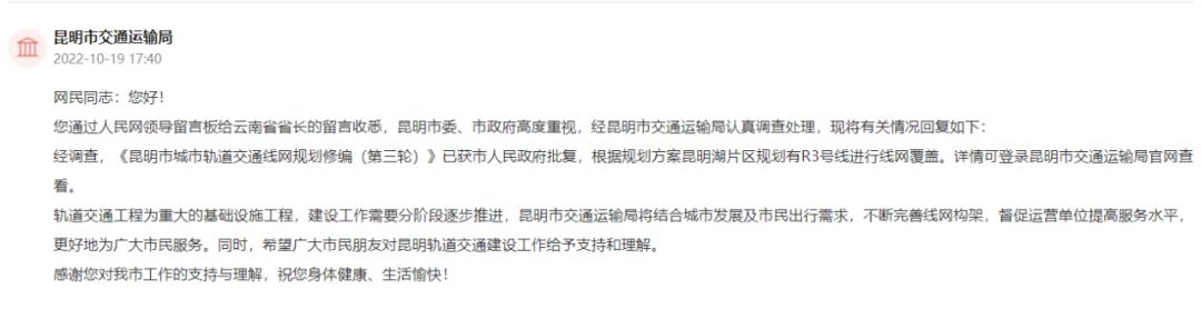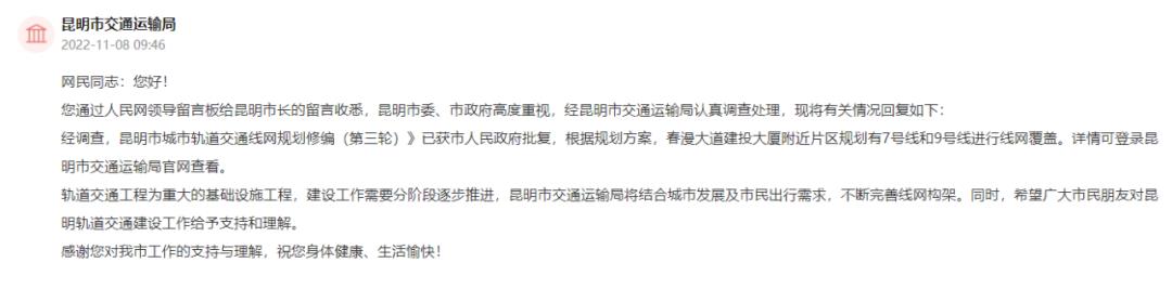 近日,人民网地方领导留言板上,关于昆明多个片区地铁规划建设的留言较多,昆明市交通运输局和相关部门给出了回复。