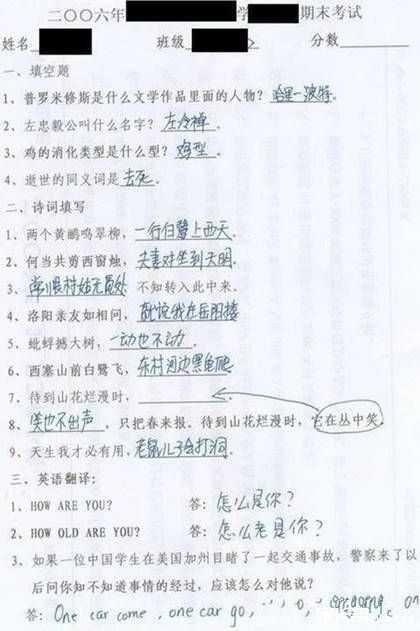 这个就有意思了,啥都没学会,学会了说脏话,嘿嘿,估计还没下发试卷你就被老师叫到办公室里训话了!小学生的搞笑试卷,看一次笑一次,你无法想象他们有多“天才”!
