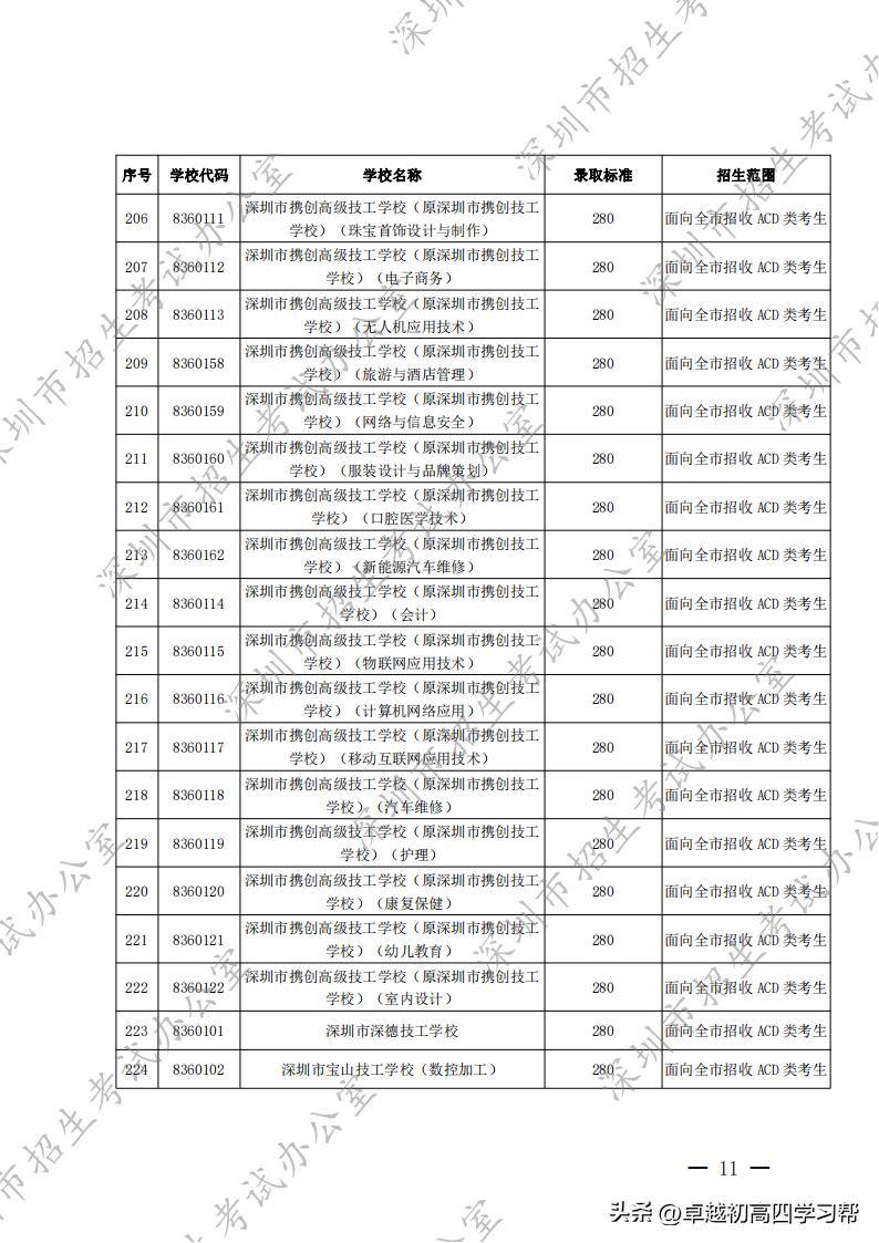 一、深圳市今年各高中阶段学校(含普高、职高、中专、技工学校)的最低录取标准(分数线)根据各学校的招生计划、考生所报志愿顺序、六科原始总分、单科等级、初二生物与地理学业水平考试成绩及综合表现评价等级等条件划定。投档的原则是“分数优先、依照志愿顺序”。