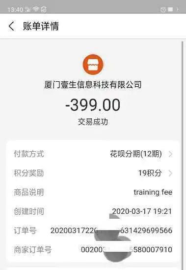 账单详情显示,赵女士在2020年3月17日缴费399元,付款方式为花呗分期(12期),收款方为厦门壹生信息科技有限公司,“我是分期付款的,没卖出货,现在每个月还要付30块钱。”