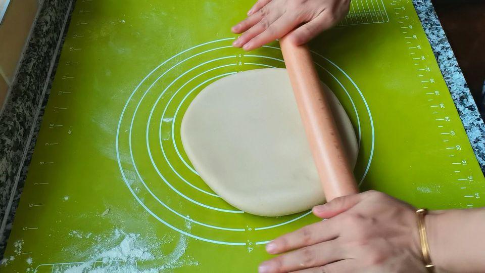 5,醒好的面团,揉搓一会儿,擀成大薄饼,比饺子皮稍微厚一点就可以了。