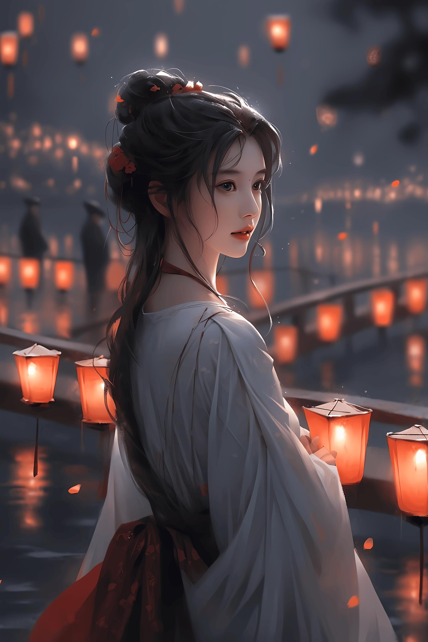 关键词翻译:大气的夜景,秦淮河畔,灯火辉煌,雾蒙蒙,面对镜头,面部特写,正面透视,一个美丽的中国古代女孩站在河边,精致的脸庞,精致的服装,丝绸,史诗般的风格,优雅的背景,高分辨率,大清晰度,准确的色彩,逼真的色彩,高保真度,完美的品质,超级细节,细致的人物,高对比度、逼真、极其细致、全景