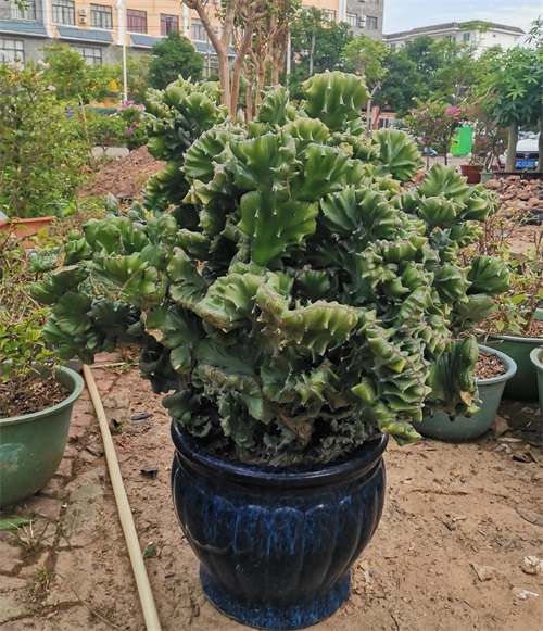 今天仍介绍一种多肉植物,大号麒麟掌,别称:麒麟角、玉麒麟等;为大戟科、大戟属常绿肉质植物。原产印度支那干旱、炎热、阳光充足的地区,我国有引进,多在南方培育繁殖;此物为“霸王鞭”的带化变种,具棱的肉质茎变态成鸡冠状或扁平扇形之态,其它方面与霸王鞭基本相同。