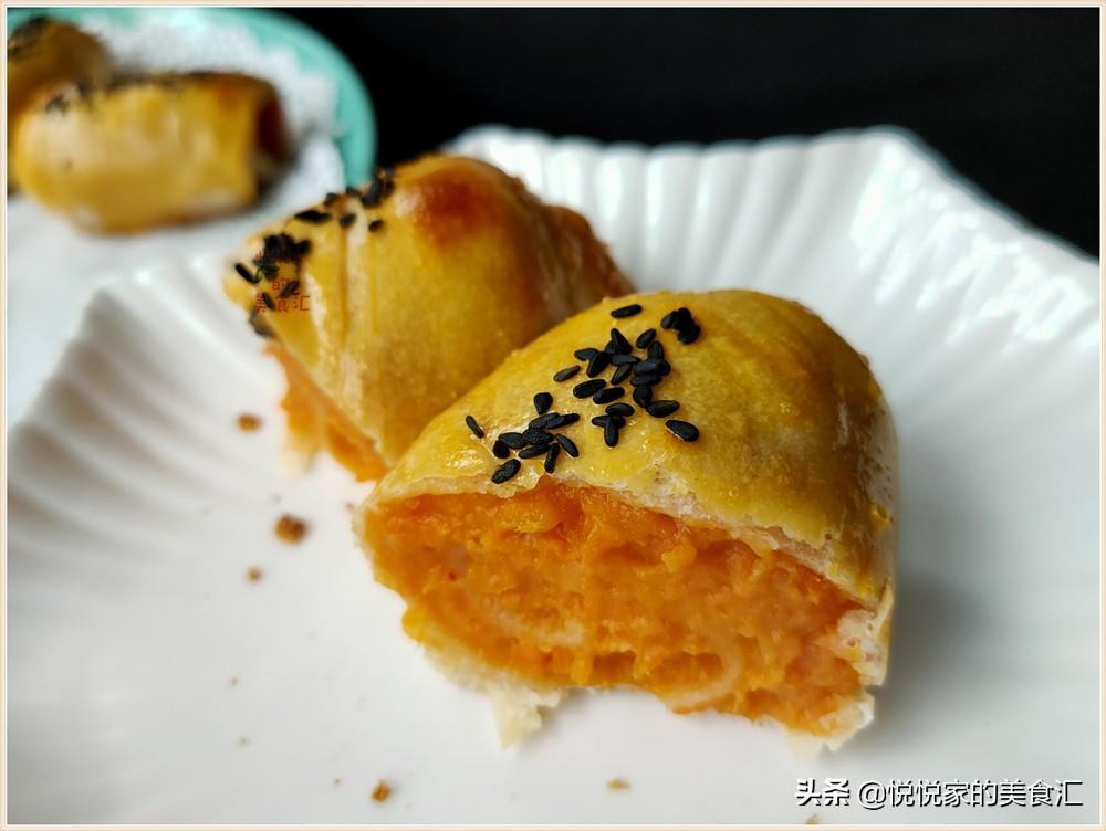 4.烤熟取出后发现手抓饼已经被烤得层层酥脆,层次分明,用手轻轻一碰就酥得掉渣了,放入嘴里后葱香浓郁,酥脆可口,里面的南瓜馅料香甜软糯,用手一扯的话糯性十足,甜甜的馅料再加上酥脆的表皮形成了鲜明的对比。