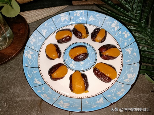 3.接下来取一个鹌鹑蛋大小的剂子团圆,夹入切开后的红枣里面,再摆入盘中上锅蒸20分钟就可以吃了,因为糯米团蒸熟后比较黏,摆盘的时候一定要分开哦,不然会粘成一张大饼哈。