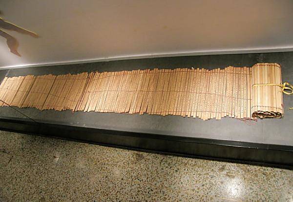 编“册”时,可以根据所书内容的长短,来决定编多少枚简。一般编绳有两道、三道、四道甚至五道的,视简册的长短而定。编绳有丝纶、麻绳或皮革。我们听孔子晚年读《易》,“韦编三绝”,其中的“韦”指的是熟皮。也就是说,孔圣人读的《易经》,是用熟皮编成册的,看的遍数太多了,所以屡次“断绝”(三指多次),因为孔子所处年代更早,他读的书,很可能是甲骨编成的“册”,但基本意思不差。