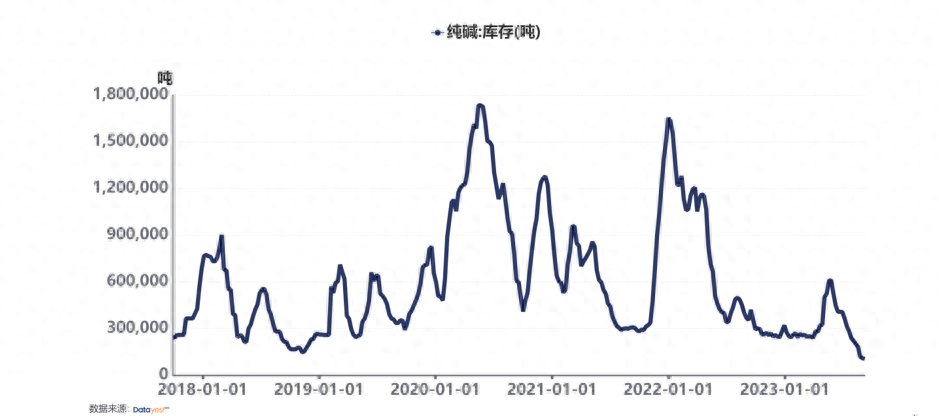 在价格上涨的同时,则是纯碱库存的持续走低。隆众资讯数据显示,截至9月7日,本周国内纯碱厂家总库存12.47万吨,环比减少1.66万吨,下降11.75%,同比下降71.62%。记者留意到,这已经是纯碱厂家库存连续下滑11周,当前库存再度刷新近期历史最低纪录。